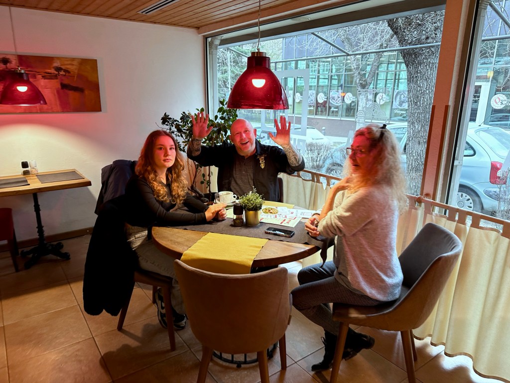 Sie waren turnusmäßig mit dem Aussuchen des Lokals dran, wollten aber entgegen meines Vorschlags das Wochenende nicht vermeiden (wir sind doch alle Rentner – bis auf Karin😂). Also bekommen wir während unserer Anfahrt eine Nachricht, dass sich die Adresse geändert habe. Wie sich herausstellte, war das ursprünglich gewählte Lokal zwar menschenleer als sie ankamen, dummerweise waren aber ALLE Tische reserviert. 😩