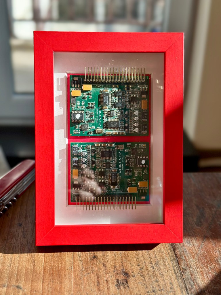 Ein anderes Projekt endete gestern in Kunst. Ausnahmsweise mal von mir und nicht der Familienkünstlerin. Seit der Reparatur meiner Boxen liegen die ausgetauschten Platinen auf dem Tisch vor mir und ich habe sie nicht wegwerfen können. Die filigrane Technik gefällt mir einfach.
