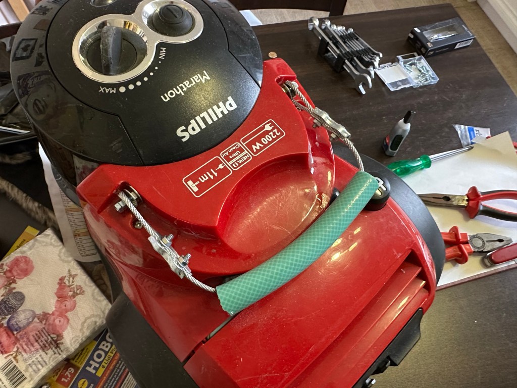 Ich habe ja oben erwähnt, dass ich heute das Werkzeug rausgeholt habe. Mir war nämlich eine Idee gekommen, wie ich den letzte Woche endgültig irreparabel abgerissenen Tragegriff des Staubsaugers reparieren könnte. Also Kiril telefonisch um ein Stück alten Gartenschlauchs gebeten, dann zum Baumarkt und los!