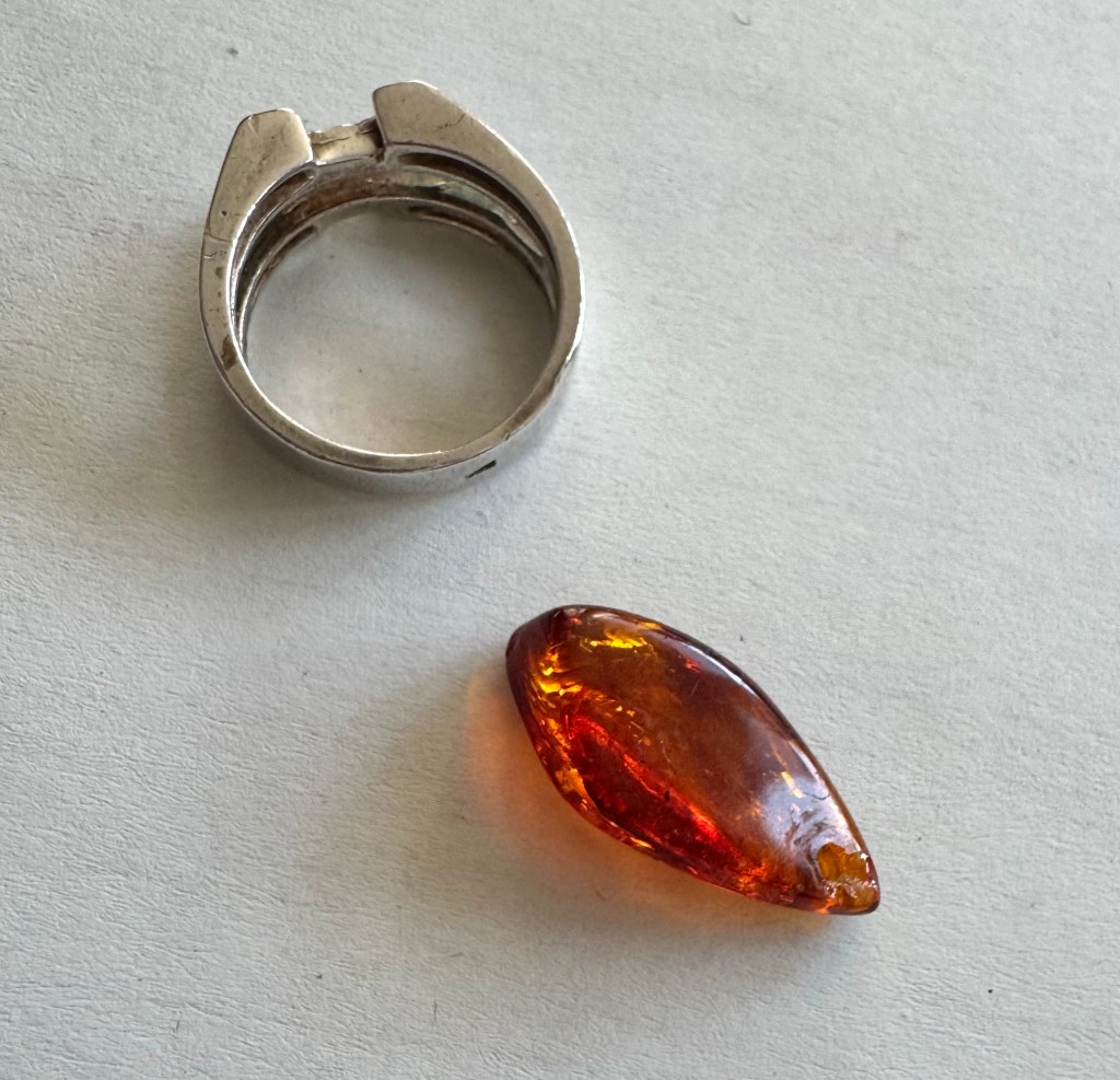 Ein weiteres Projekt hat sie mit Hilfe ihrer Lieblingsschmuckverkäuferin in Angriff genommen: Eine Ringschiene ihrer Mutter ohne Stein soll mit einem Bernstein ohne Ring verbunden werden. Darüberhinaus muss der Ring auch geweitet werden. Was das wohl kostet?