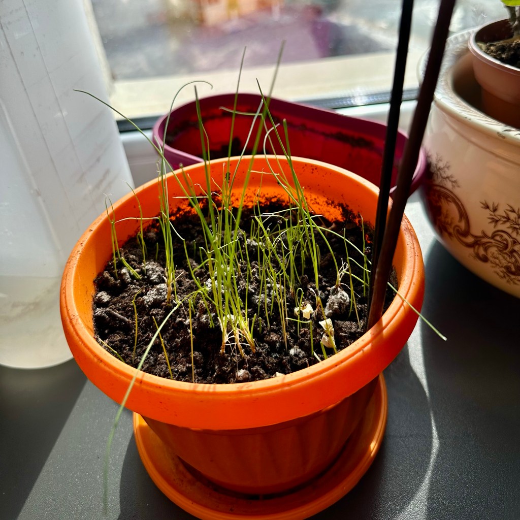 Fast hätte ich es vergessen, es gibt Erfolge an der Schnittlauchfront. Die erst Nachsaat zeigt sich zwischen den fünf alten Halmen.