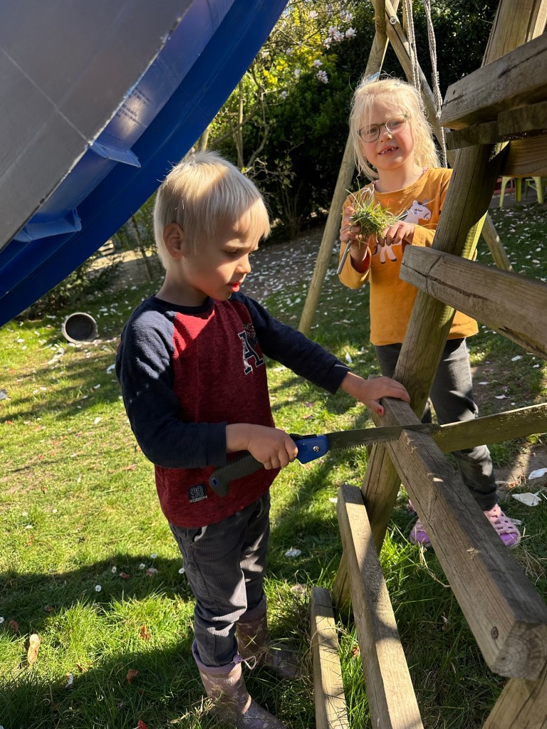Enkel vom Kindergarten abholen, mit ihm Rasen mähen und Balken zersägen, Arbeitsaufträge der Tochter für die nächsten Monate 😂 entgegennehmen und diverse Arbeiten wie Hosen einer Freundin der Tochter flicken (für Karin) oder Kleinanzeigenkäufe abholen mit dem Schwiegersohn (für mich) waren unsere weiteren Beschäftigungen.