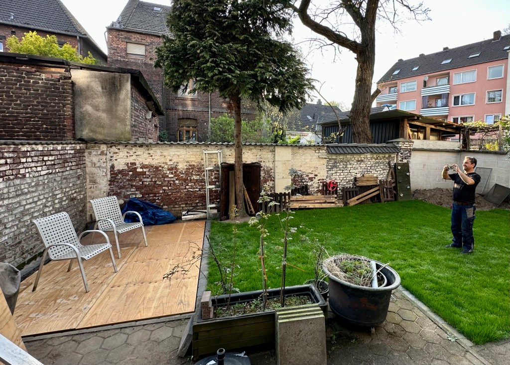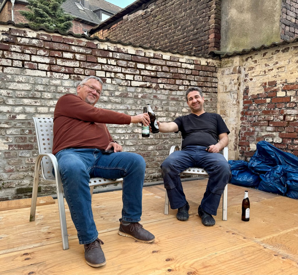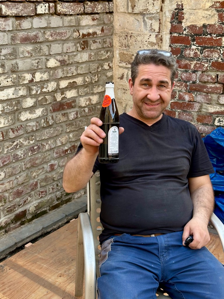 Wieder zurück bei unseren Gastgebern sehe ich den Hausherrn ebenfalls heimwerkern. Hier wird der Garten komplett saniert und die Terrasse war dran. Ich durfte immerhin eine Platte tragen und Bier beisteuern. Wer die Flaschen genauer betrachtet, erkennt sofort, wer die besorgt haben MUSS. 😎