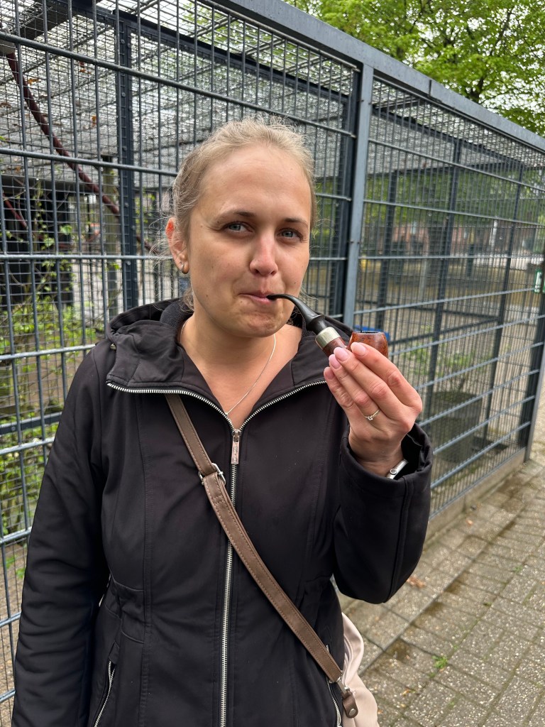 Sonntags ging es mit alle Mann und einer Freundin mit Kind nach Mülheim in einen schönen Park. Kaum angekommen gab es einen Wolkenbruch, der uns einige Zeit unter ein Schutzdach zwang. Danach war es aber richtig schön, bis Karin wieder Rückenbeschwerden bekam. Das einzige Foto vom Ausflug zeigt aber unsere Jana, die mir meine Pfeife mit den Worten entriss: Jetzt bin ich erwachsen, jetzt darf ich endlich mal an deiner Pfeife ziehen!