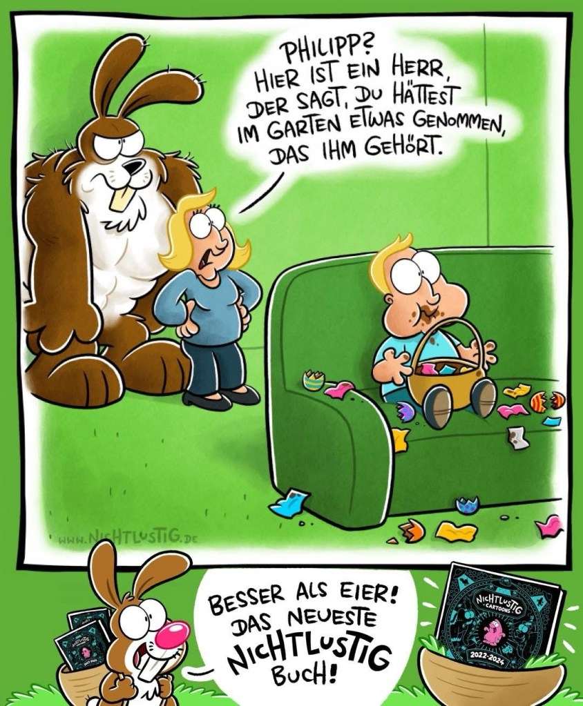 Und weil zur Osterfreude traditionell auch das Osterlachen (über die Niederlage von Hölle, Tod und Teufel!) gehört, hänge ich mit Vergnügen und Absicht wieder ein paar Netzfundstücke an.