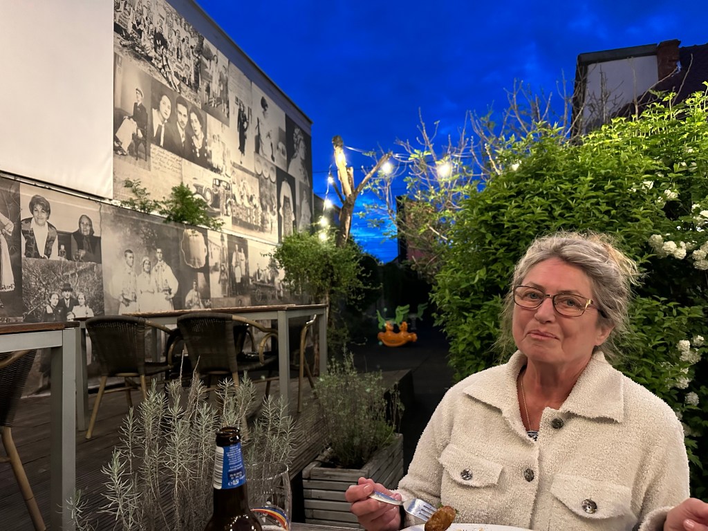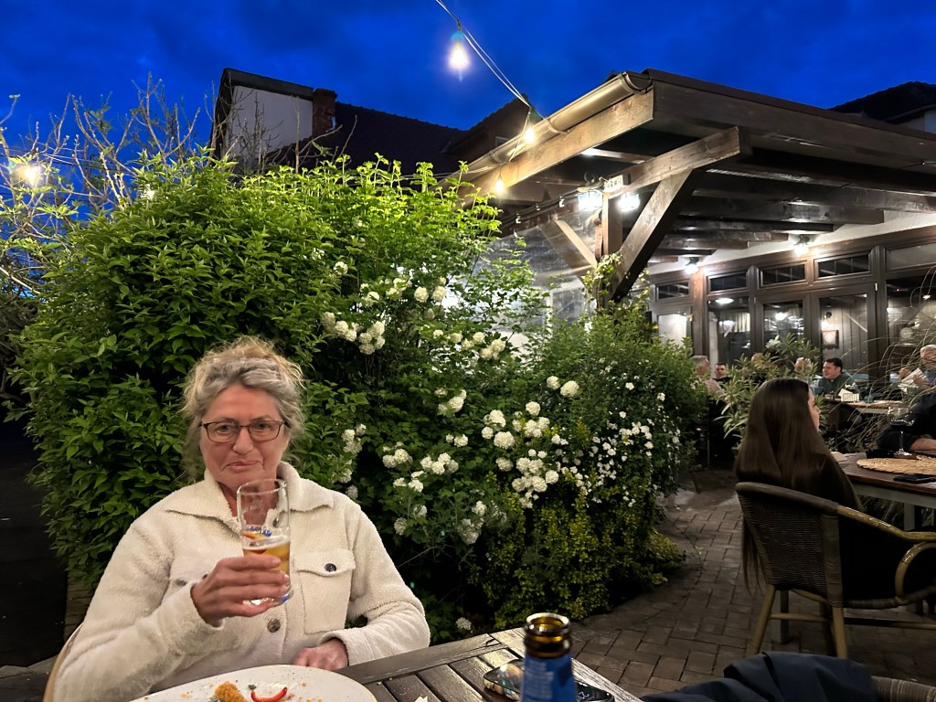 Karin war anfangs etwas angewidert, weil sie die „Küche“ auf der mit Fenstern verschlossenen Terrasse eklig fand. Am nächsten Morgen stellte sich aber heraus, dass sie wohl die Hinterlassenschaften eines anderen Bewohners für den Gesamtzustand gehalten hatte. Aber am Abend war uns nicht nach dort essen, im Zimmer wollten wir wegen des schönen Wetters auch nicht bleiben, also Google befragt und zu einem Lokal in der Nähe gefahren. Draußen gab es nur ein Schild und so etwas wie ein Garagentor, aber wir wissen, das bedeutet hier nichts. Und so war es. Ein tolles, fast hippes Restaurant mit umfangreicher Weinkarte.