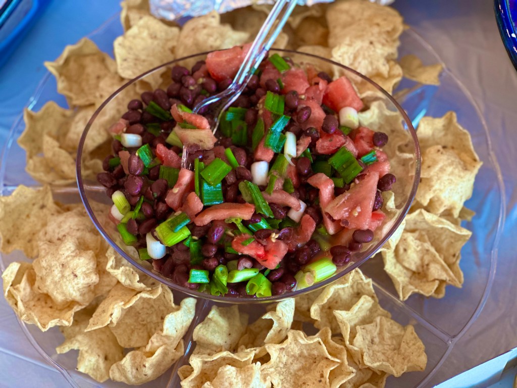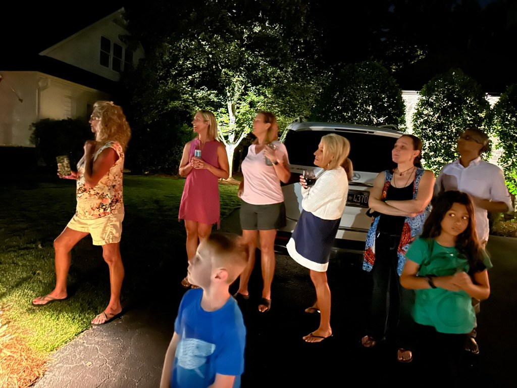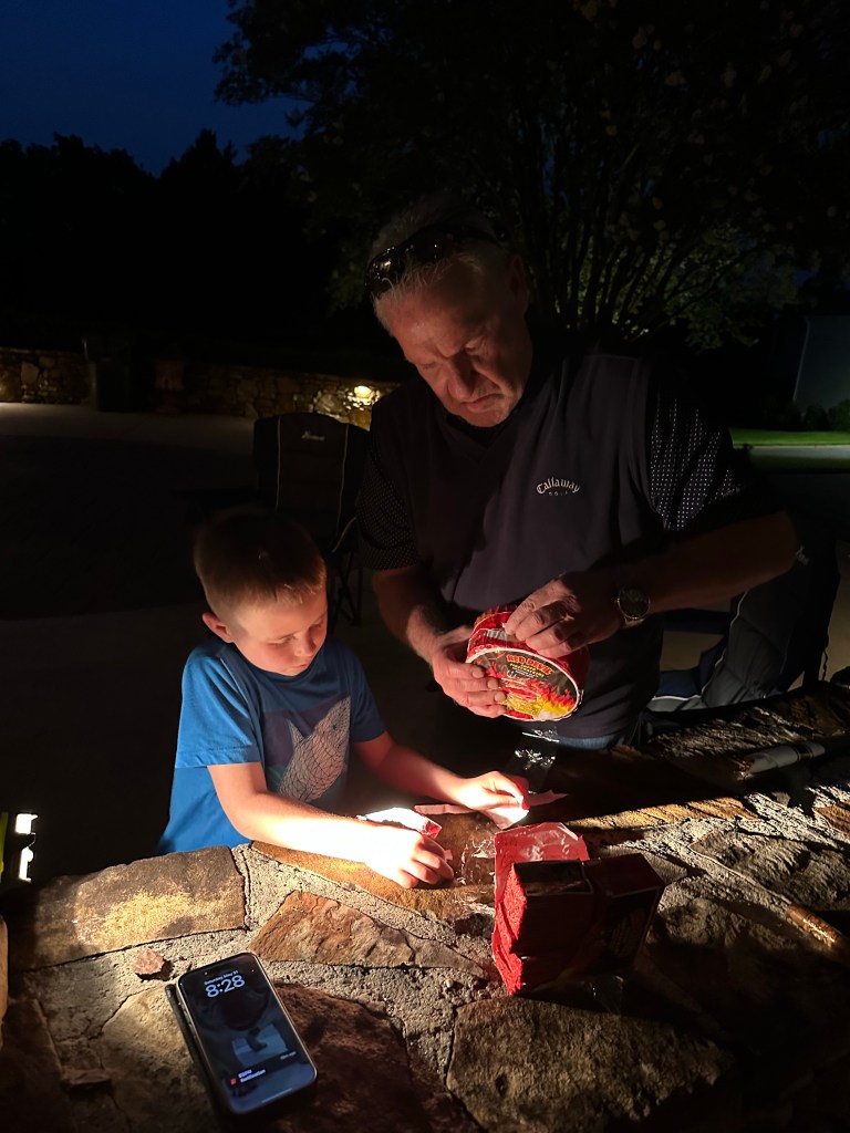 Brad hat noch ein paar Würste gegrillt und dann gab es Pizza (aus dem Laden🤣), Folienkartoffeln, Cracker in Schüsselform mit Dipps, Karins legendäre Frikadellen und noch ein paar andere Leckereien. Nachbar „Mister Ron“ hatte letztes Jahr wohl als Überraschung für die Kinder Feuerwerk abgebrannt und ganz zufällig hatte er für die Kleinen und Großen wieder etwas parat.