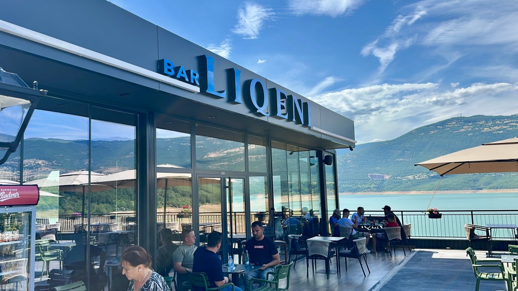 Ich bin dann kurz vor der Werkstatt in ein sehr modernes Lokal am Stausee eingekehrt, weil ich dringend etwas Schatten und Flüssigkeit brauchte. Entgegen des eher luxuriösen Ambiente waren die Preise niedlich: Mocca mit Eiswasser für 0,70 € und Aussicht.