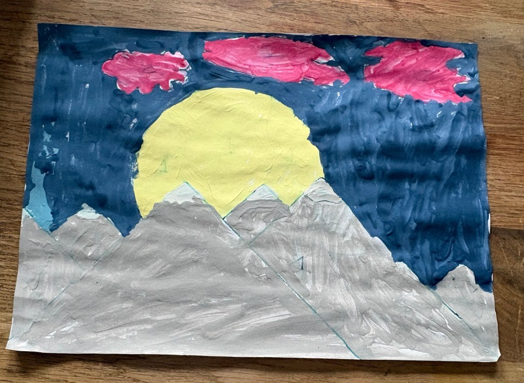 Das Ergebnis ist zwar gut, aber ohne die Vorgeschichte nicht als solches bemerkenswert. Als die Maler-Oma (Karin) in daraufhin per Video lobte, aber die roten Wolken zaghaft kritisierte, musste sie sich belehren lassen, dass die natürlich wegen des Sonnenuntergangs rot sein mussten. 😂