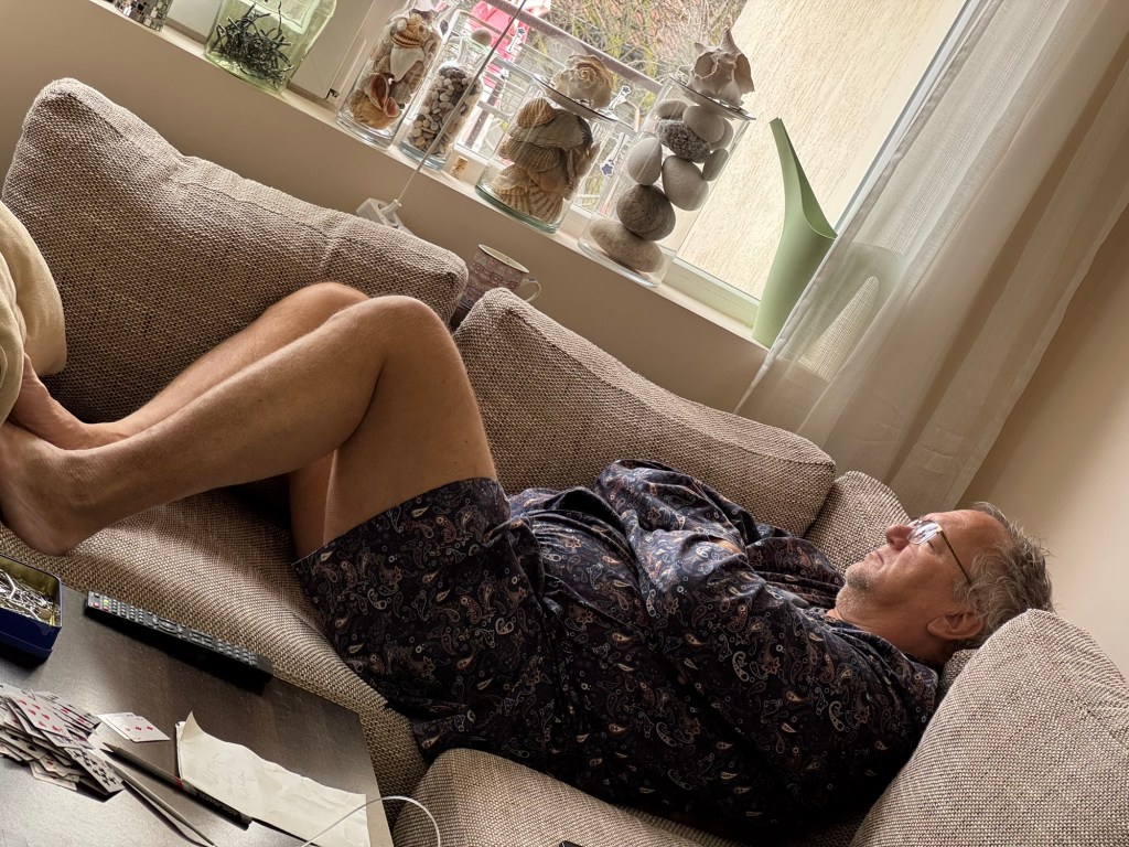 Ganz im Ernst ist das mein morgendlicher „Katzenplatz“: warm und sonnig, bequemer als das Sofa nebenan und mit Karin und Kaffee in Reichweite. Gültig, solange ich nicht auf den Balkon kann. Übrigens habe ich dort meistens die Augen offen und statt Tageszeitung mein Smartphone in der Hand, um Nachrichten und mehr oder weniger interessante Beiträge zu lesen.