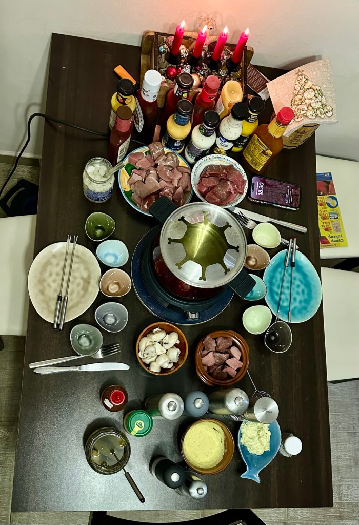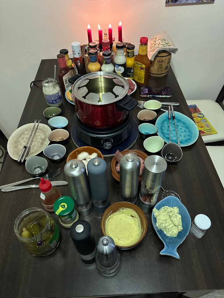 Zurück in der Wohnung „musste“ ich den Rest der Zigarre auf dem Balkon aufrauchen. Gute Zigarren brennen nämlich ewig. Karin hat derweil noch letzte Vorbereitungen fürs Weihnachtsfondue getroffen, bevor es dann losging.