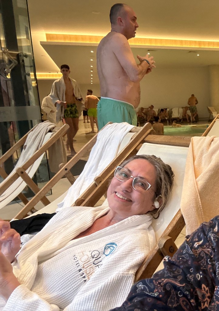 Wir wurden wieder gleichzeitig massiert und sind dann weitergezogen zu Saunalandschaft und Thermalbecken…