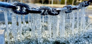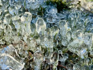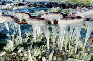 Karin und ich sind also vorige Tage getrennt unterwegs gewesen. Normalerweise bleibt ja einer von uns zuhause „wegen Gründen“, wenn es den anderen in die weite Welt hinauszieht. Aber aus atmosphärischen Gründen waren wir diesmal beide unterwegs. Karin ist mit dem Auto durch die Gegend geschaukelt und hat beim Lidl-Kreisverkehr eine total zugeeiste, eindrucksvolle Brunnenumgebung gefunden.