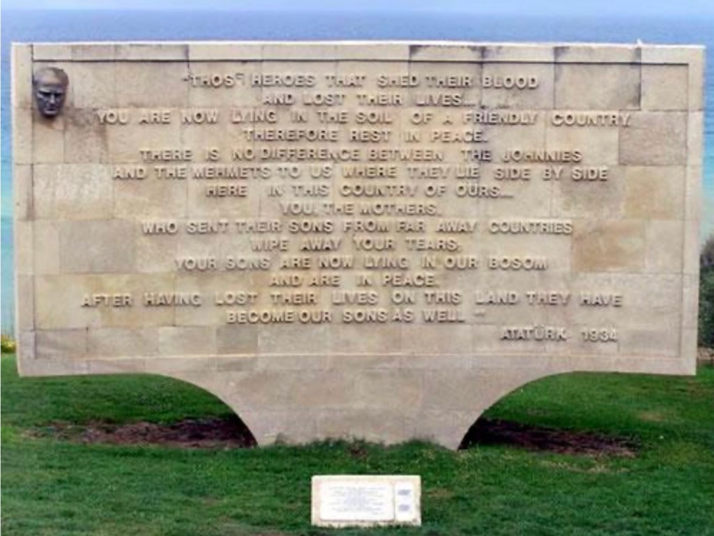 „Diese Helden, die ihr Blut vergossen und ihr Leben ließen… ihr liegt nun in der Erde eines befreundeten Landes. Daher ruhet in Frieden. Denn es gibt für uns keinen Unterschied zwischen den Johnnies und den Mehmets, dort wo sie Seite an Seite in diesem unserem Lande liegen… Ihr, die Mütter, die ihre Söhne aus weit entlegenen Länder schickten, wischt weg eure Tränen. Eure Söhne liegen nun an unserer Brust und sind in Frieden. Ihr Leben in diesem Land verloren zu haben, machte sie genauso zu unseren Söhnen.“