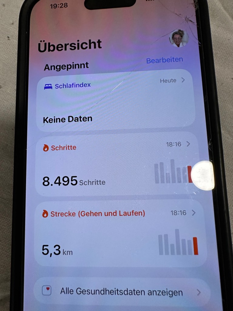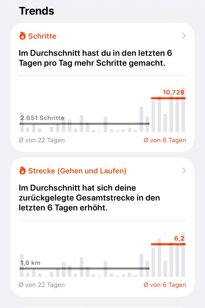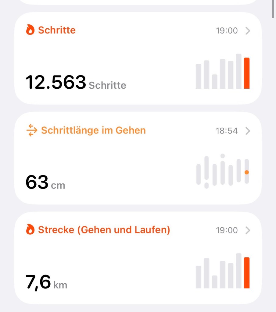 Auf iPhones läuft im Hintergrund immer ein Schrittzähler mit und ich habe mit Vergnügen jeden Tag die begeisterten Lobhudeleien der Gesundheits-App zur Kenntnis genommen.