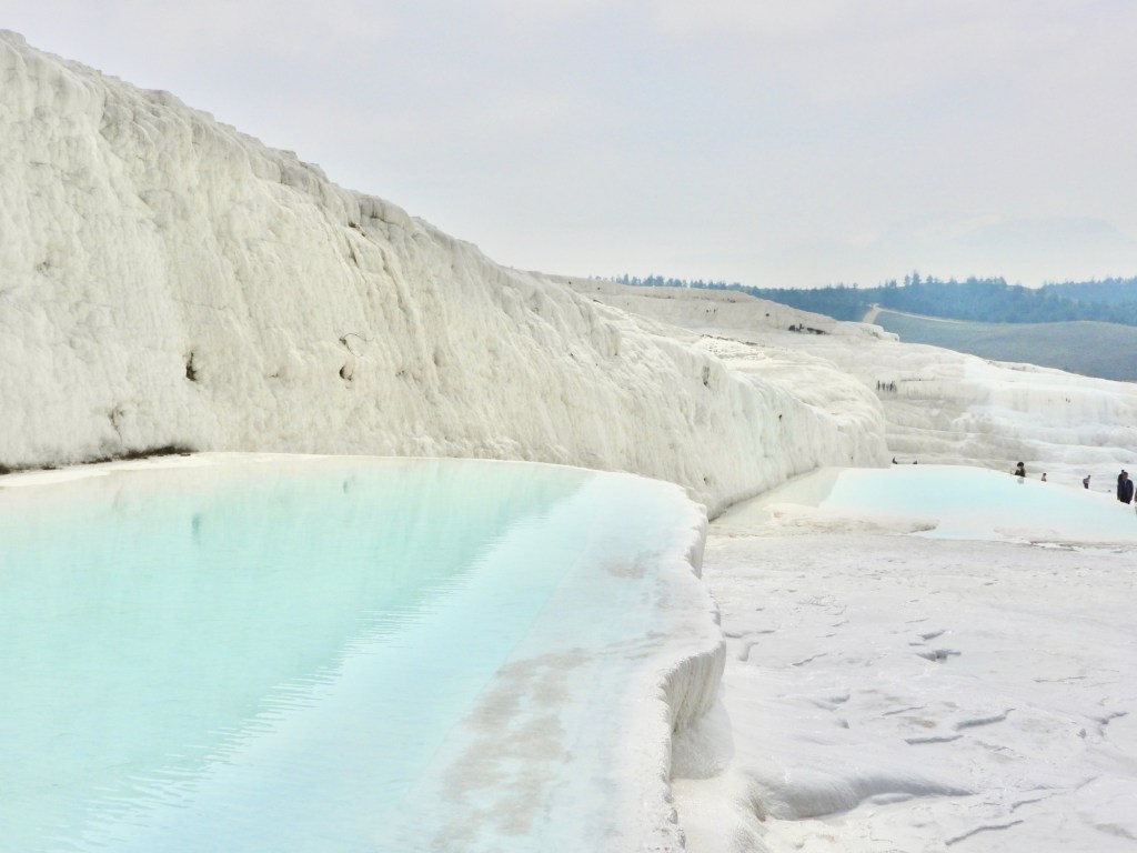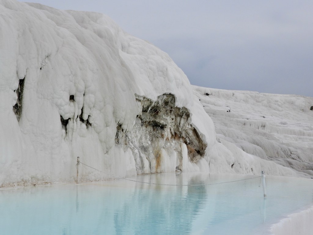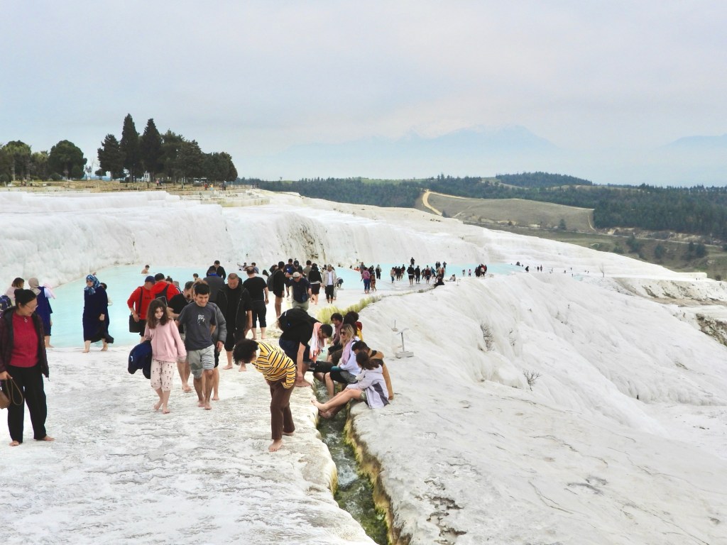 Hinweis: Die coolen halbrunden Bassins aus der touristischen Werbung sind zur Zeit abgesperrt und nicht gefüllt, aber auf dem Anstieg gibt es genügend angelegte (?) Kalkbecken. Es ist zwar warmes Mineralwasser, wir wollten trotzdem nicht plantschen.