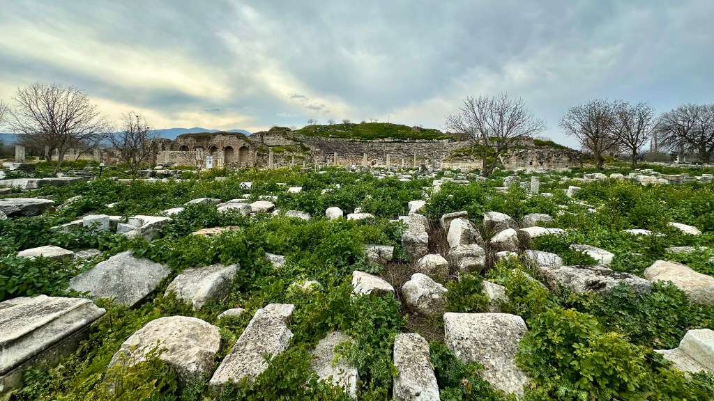 Nach den drei schönen, aber keineswegs erholsamen Tagen in Bodrum (gedankliche Notiz: Für Ruhetage sind Appartements besser als Hotelzimmer) hatten wir eine längere Etappe quer durchs anatolische Hochland geplant. Etwas neben der kürzesten Route lag noch ein mögliches Zwischenziel, dessen Besuch wir von Wetter und Vorankommen abhängig machen wollten. Die Fahrt war gut, weder langweilig noch besonders interessant – wir konnten etwas gucken und unterschiedliche Eindrücke sammeln. Das Wetter wurde trüb und noch etwas kälter, blieb aber trocken, weswegen wir kein Problem damit hatten, Aphrodisias als Zwischenstopp anzufahren.