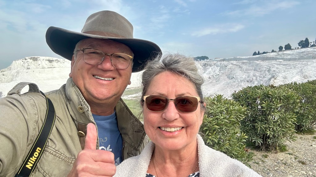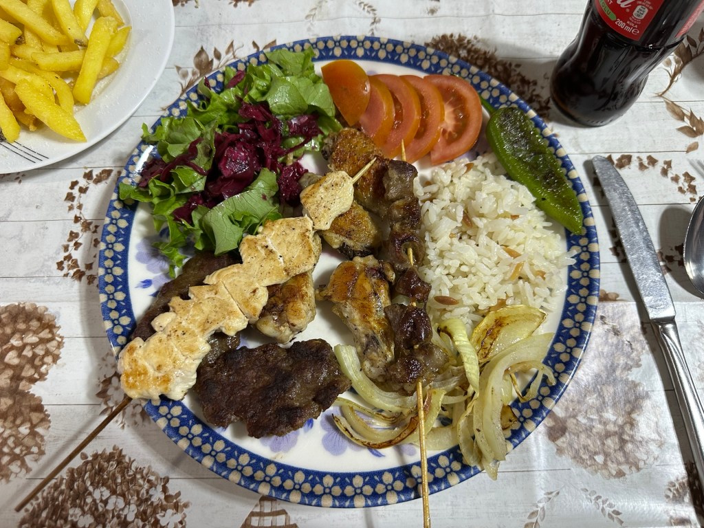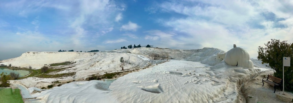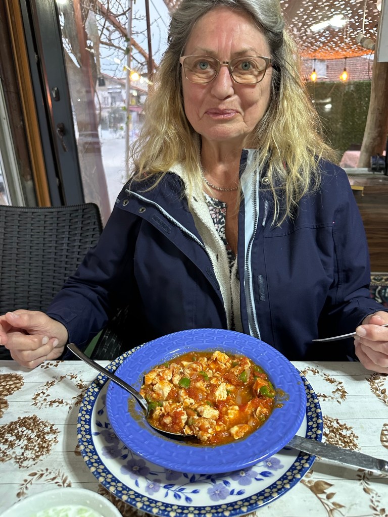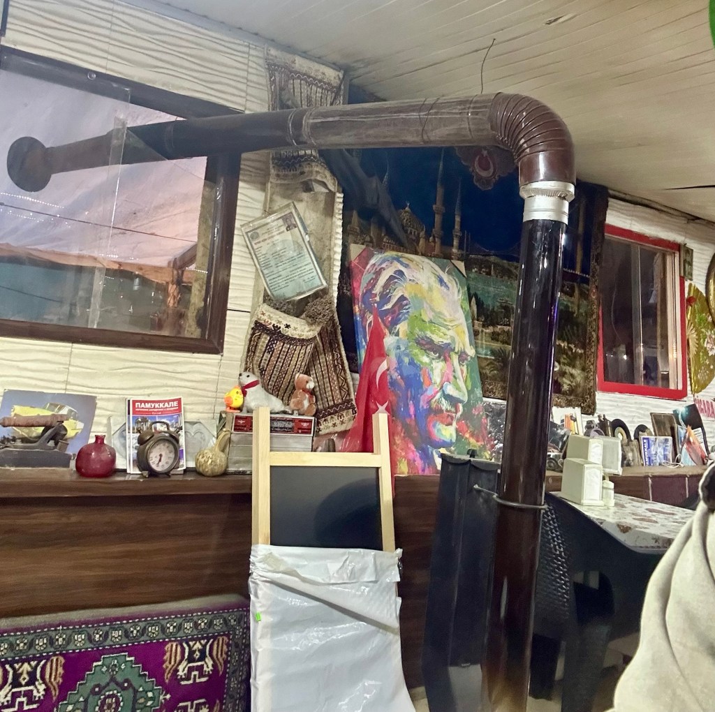 Unser „Glück“ mit den Restaurants sollte sich etwas abgemildert fortsetzen. Am Abend unserer Ankunft haben wir einen kurzen Spaziergang an einigen offenen (!) Lokalen entlang gemacht und hier und da in die Speisekarte geguckt. Natürlich: Je mehr Blick auf die Kalkterrassen, desto mehr Lira pro Speise. 😎